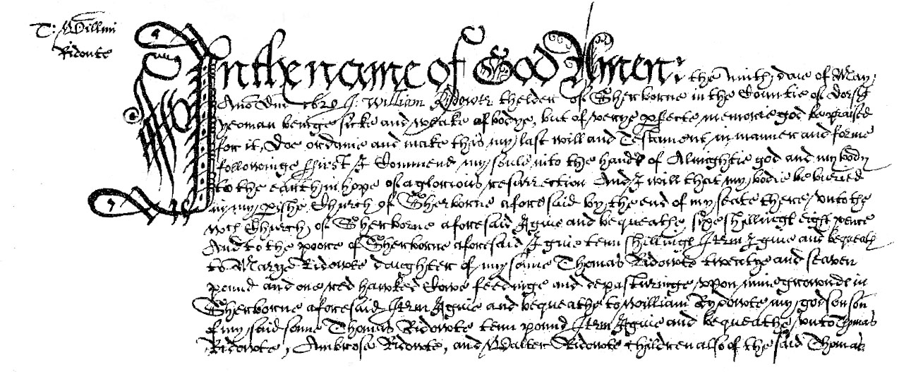 In the name of God Amen. The ninth day of May Ano Dm [AD] 1620, I William Ridowte the elder of Sherborne in the Countie of Dorset, yeoman, being sicke and weake of bodye but of sound and perfect memorie, God be praised for it, Doe ordaine and make this my last will and Testament in manner and forme following.