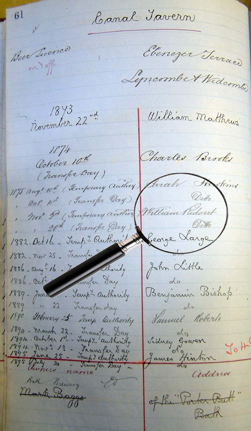 Licence transfers for the Canal Tavern. William's entry in 1875.