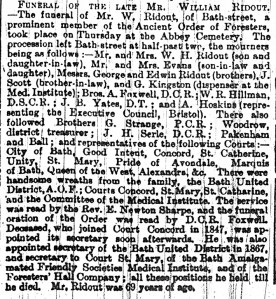 “The members of the Bath United District have suffered a sad blow in the death of Bro W Ridout, who for so many years has discharged the duties of District secretary. Bro Ridout was also secretary of the Foresters’ hall and of the Bath Friendly Societies Medical Institute and at the time of his death had entered his 70th year. The burial took place in the Abbey Cemetery on Thursday 5th May, when a large number of members and friends attended to pay their last respects to his memory. Upon the conclusion of the usual service, the funeral service of the Order was read in an impressive manner by Bro Foxwell, DCR.”