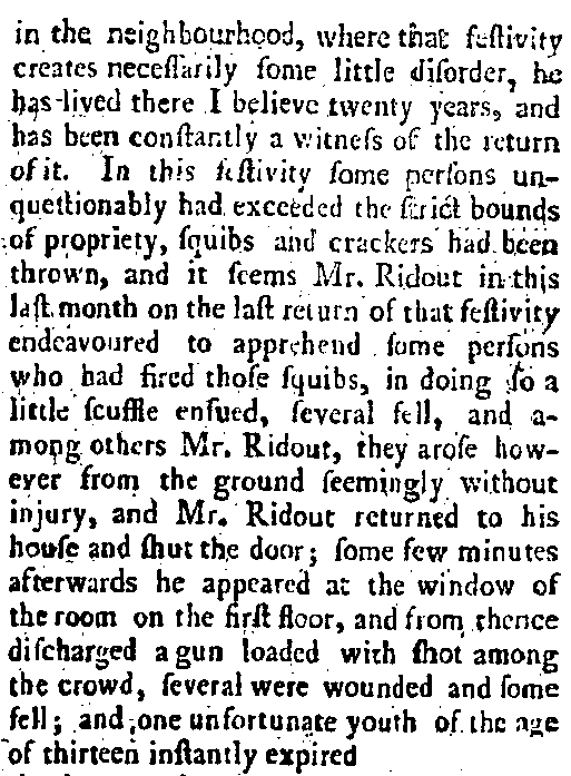 178410200003On the 20th October, 1784, Porter Ridout was indicted “that he, not having the fear of God before his eyes, but being moved and seduced by the instigation of the Devil, on the 7th of October, in the 24th year of his Majesty’s reign with force and arms, at London, in the parish of St. James’s, Duke’s-place, upon Moses Lazarus, in the peace of God and our Lord the King then and there being, did make an assault, and with a certain gun, value 1 shilling, then and there loaded with gun-powder and leaden shot, which he held in both his hands, to, at and against the said Moses, feloniously, wilfully, and of his malice aforethought, did shoot and discharge, and him the said Moses in and upon the right breast, and in and upon the right side of the body, near the upper part of the belly, did then and there feloniously, wilfully, and of his malice aforethought, strike and wound giving to him the said Moses in and upon the said right side of the breast, one mortal wound of the depth of four inches and of the width of one half quarter of an inch, and in and upon the right side of the body near the upper part of the belly, another mortal wound of the depth of three inches and of the width of one half quarter of an inch, of which he instantly died: and the Jurors say that the said Porter Ridout, him the said Moses Lazarus did kill and murder. He was likewise charged on the coroner’s inquisition with the like murder.”