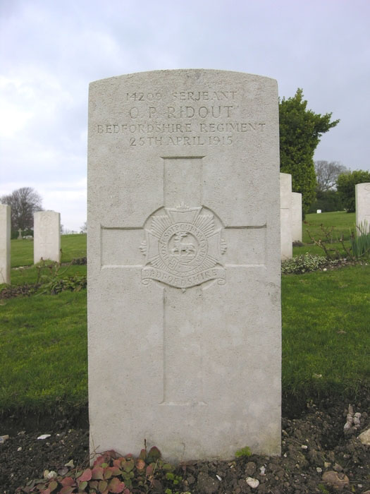 Ridout[1]Oliver Percy died on Sunday 25th April 1915; his death was registered in Steyning, Sussex. He was a sergeant in the 8th Battalion Bedfordshire Regiment and his service number was 14209. Oliver was buried in Brighton Cemetery, Bear Road, Brighton, Sussex; Oliver was one of 275 casualties of WWI buried at this cemetery.