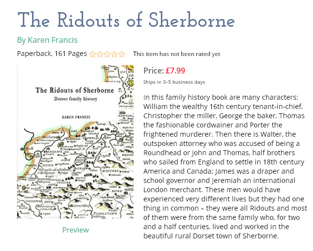 I have just found this site & ordered a copy of your book from Lulu. I am tremendously excited as this represents a step forward in connecting my known Ridout ancestors with a family tale of involvement with the great fire in Blandford Forum (vide Walter Ridout, Commissioner, rather than one of the Bastards).